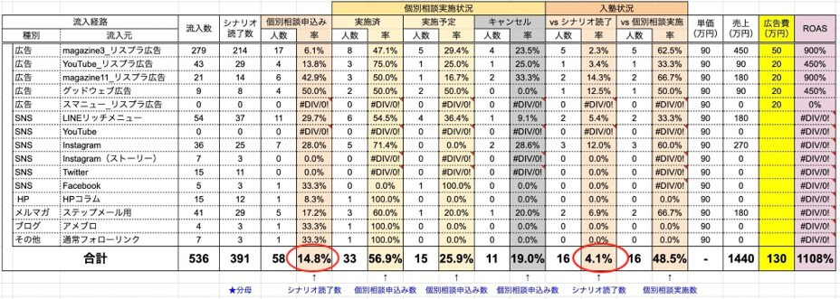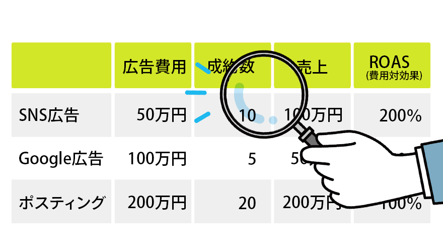 集客の経路毎に成約率(CVR)や費用対効果(ROAS)データを分析。 この分析で売上につながるシナリオ・広告戦略の最適化をします。